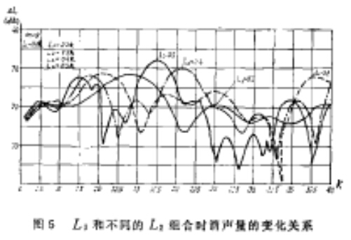 雙腔擴張式消聲器,在插入長度分別等于1/2和1/4腔長時的它的消聲量,在某些頻段總會出現(xiàn)一些低谷,綜合比較各種腔長組合而成的消聲器共消聲量的變化曲線,還是雙腔長度比較接近或相等時,消聲量的變化曲線比較平緩,有效頻段也較寬。即使在某些頻段出現(xiàn)低谷,其頻率也較窄。
